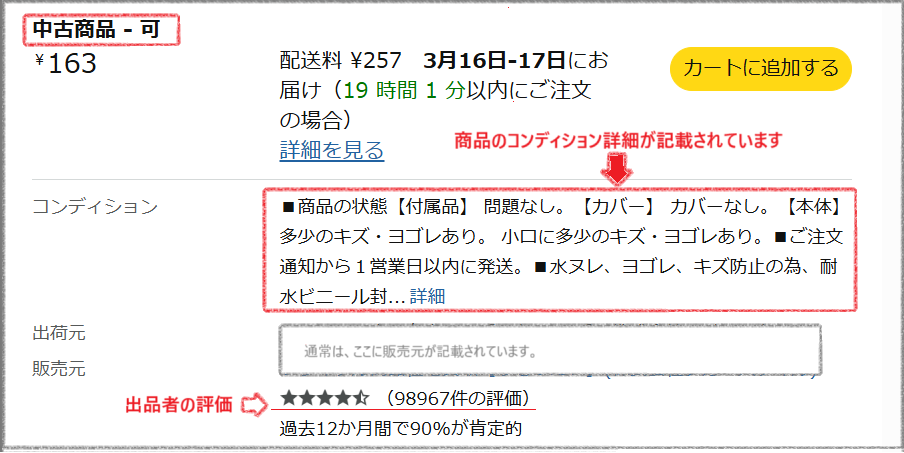 出品者の評価も重要なチェック項目です。Amazonやメルカリは、絵本の状態のランクを出品者が決めることが出来るので、出品者によってばらつきがあります。そこで、必ずチェックしておきたいのが、出品者評価。
